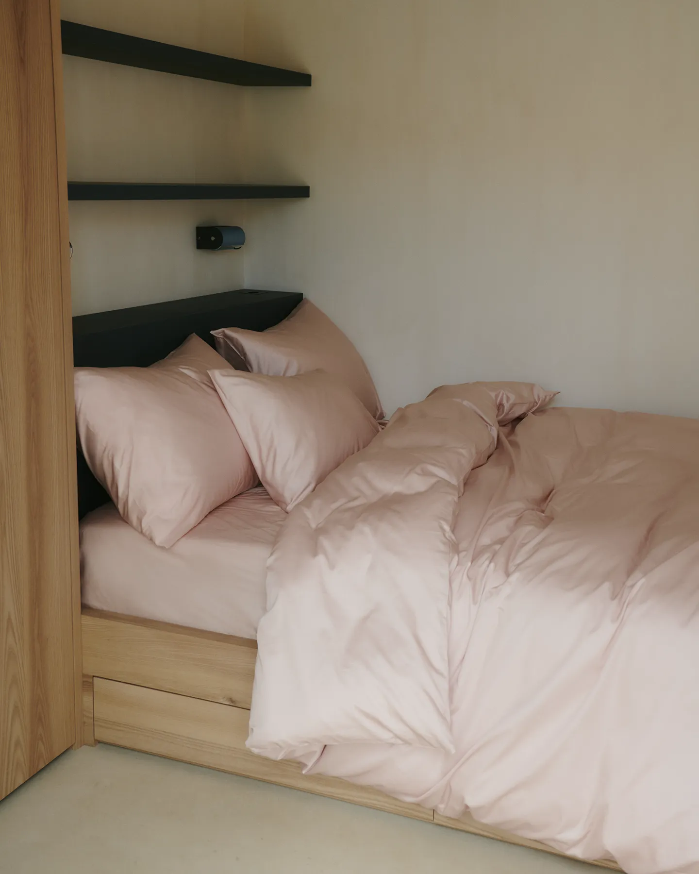 Dusty Pink är en varm, pudrig rosa nyans som adderar både färg och värme utan att bli dominerande. Den fungerar lika fint i avskalade, ljusa sovrum som tillsammans med trä, ton-i-ton eller med andra kulörer. En enkel väg till en mer inbjudande säng.